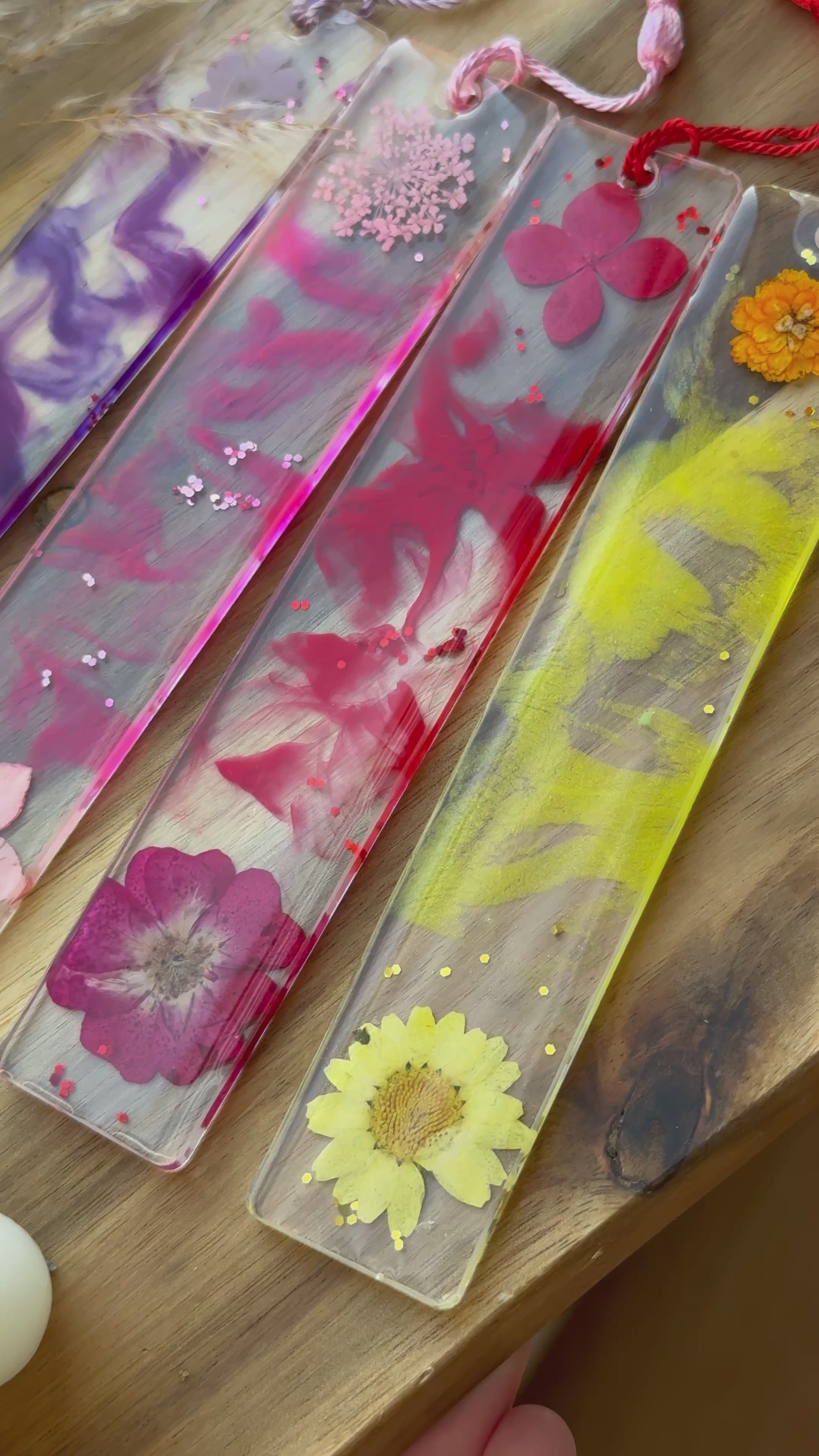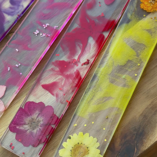 Diese einzigartigen Lesezeichen werden liebevoll von Hand aus hochwertigem Epoxidharz gefertigt und mit echten, sorgfältig getrockneten Blumen verziert.